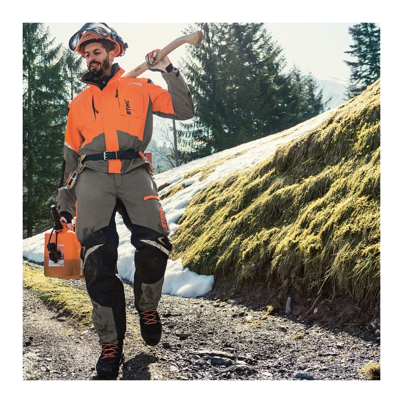 La protección anticorte STIHL está hecha en su mayor parte de materiales de protección anticorte exclusivamente desarrollados para STIHL. La ropa de protección anticorte de STIHL ha sido probada por los institutos europeos de pruebas más afamados, SMP y KWF. La protección anticorte tiene varias capas y es ligera y transpirable. Si la cadena entra en contacto con la protección anticorte, arranca muchas fibras sueltas que ofrecen resistencia a la cadena y que bloquean además el piñón de cadena. De este modo, la cadena se para reduciendo notablemente el peligro de sufrir lesiones. Para ayudarle a encontrar los artículos con protección anticorte, los hemos marcado con este símbolo aprobado conforme a EN 381.